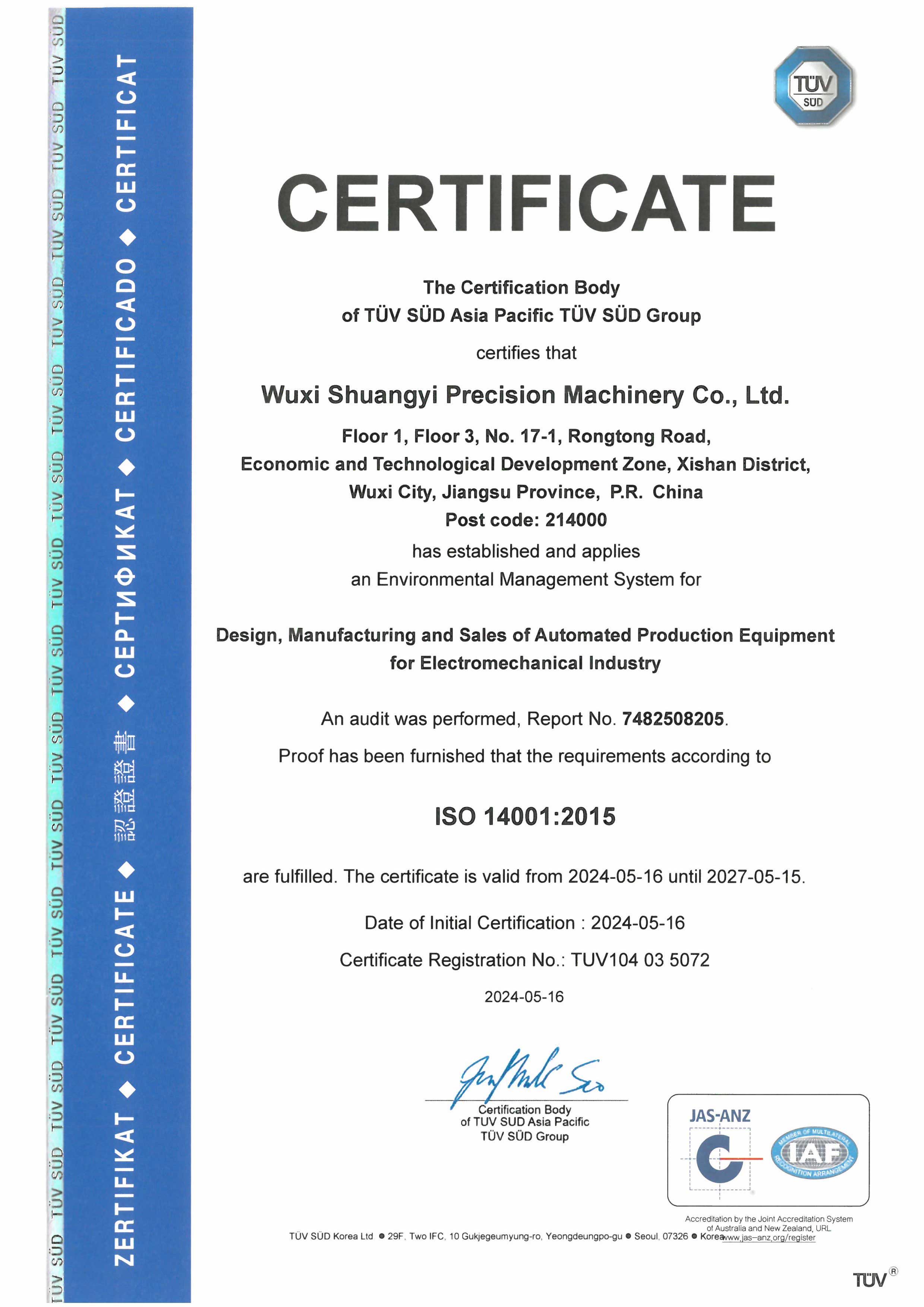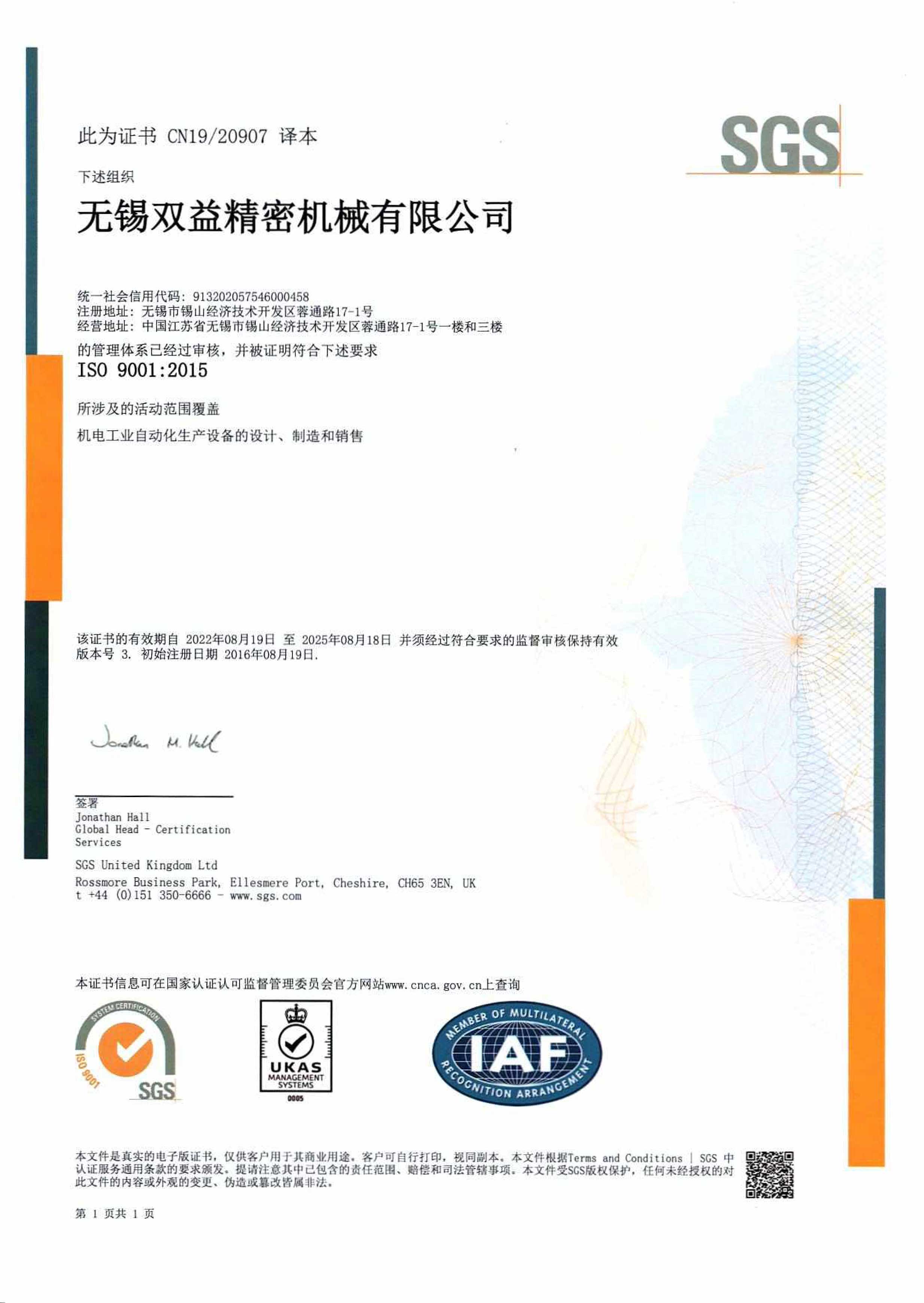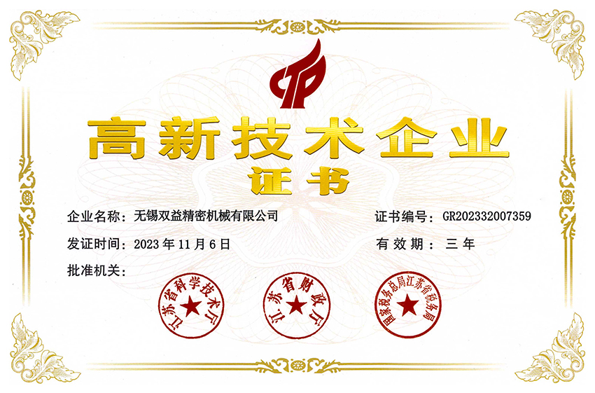 雙益精機高度重視品質管理,已通過 S G S公司的質量體系認證 ISO9001:2015、TUV公司的環境體系ISO14001:2015,職業健康安全 管理體系ISO14001:2015,能源管理體系IS050001:2018,以及知識產 權管理體系,為客戶提供安全、優質的產品。同時,公司多次被評選為 江蘇省民營科技企業,并獲得江蘇省人民政府授予的《高新技術企業》 稱號。此外,雙益精機兩次榮獲浙江省科學技術進步二等獎,獲得江蘇 省專精特新企業稱號,同時被認定為市級企業技術中心和市級工程技 術研究中心,并被認定為市級保密試點單位。